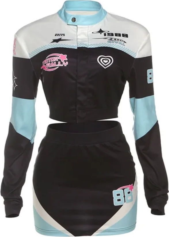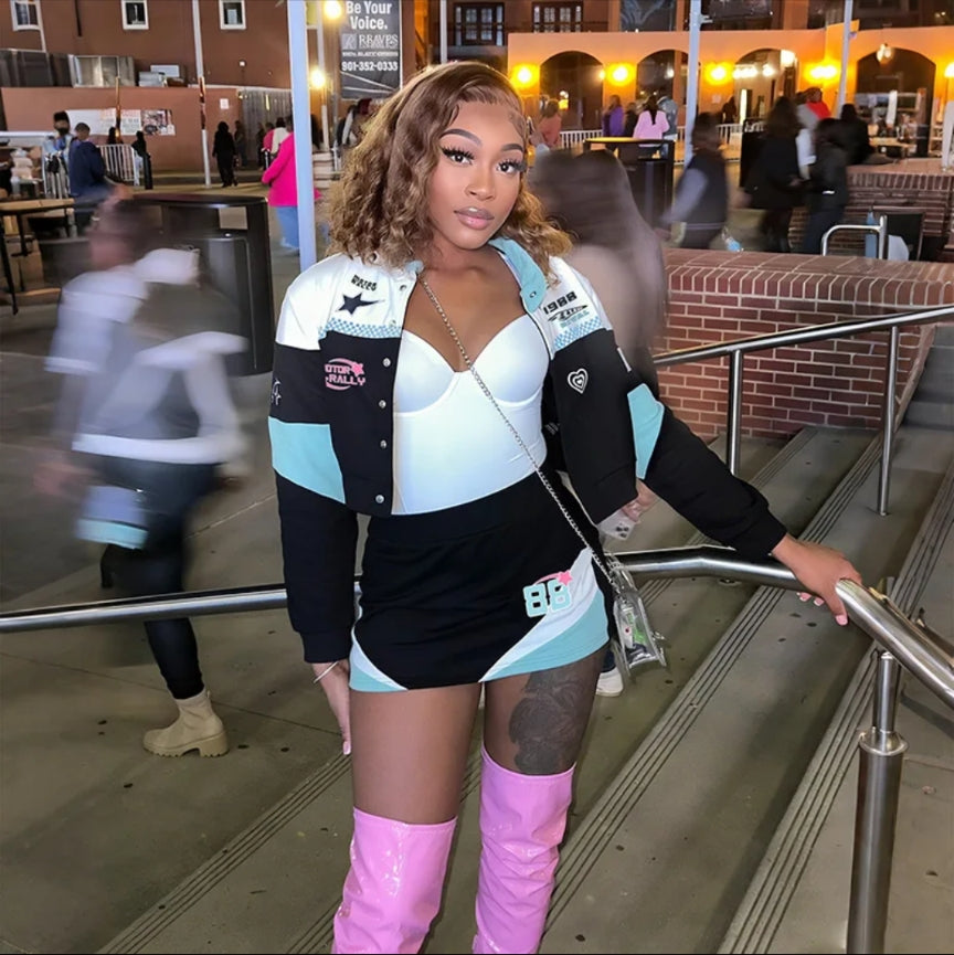 Introducing the Burning Blu set, a stylish two piece panelled zip up crop jacket and matching shorts perfect for casual wear. Made with comfortable material and a sleek design, this set is perfect for any occasion. Feel confident and fashionable with Burning Blu.